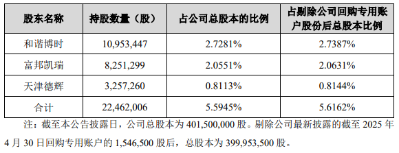 和谐博时、富邦凯瑞、天津德辉为公司首次公开发行股票上市前股东,合计持有公司股份22,462,006股(占公司总股本比例为5.5945%,占剔除公司回购专用账户股份后总股本比例为5.6162%),上述三位股东之间未签署一致行动协议。