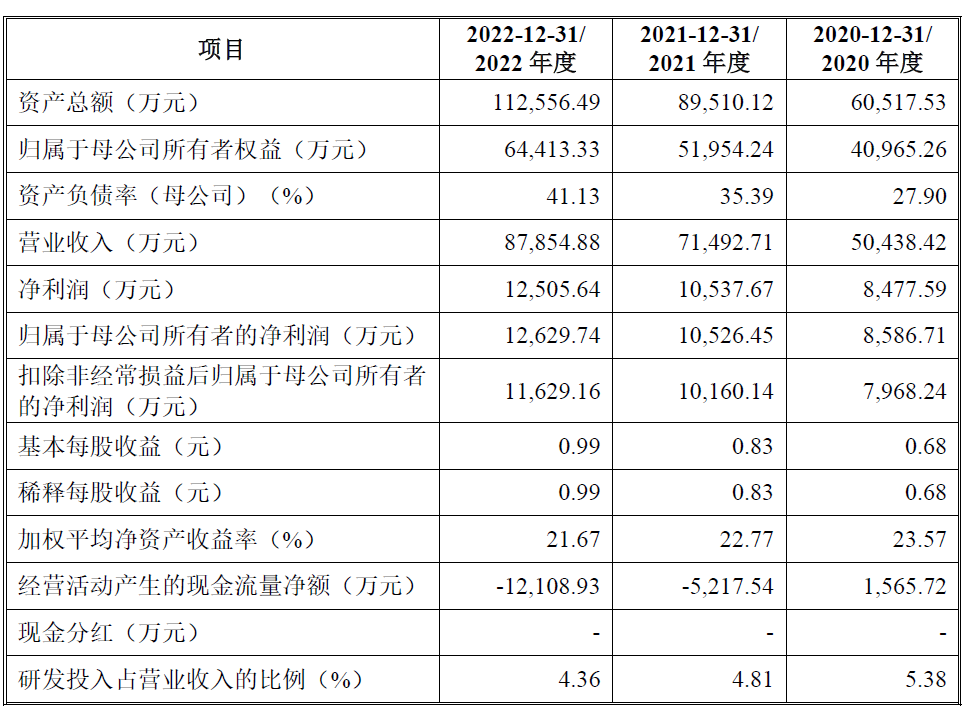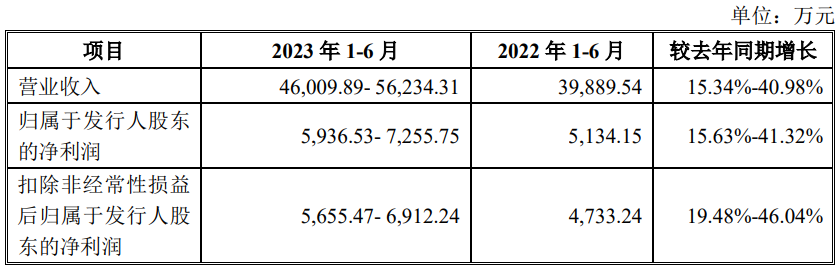 公司预计2023年上半年营业收入46,009.89万元-56,234.31万元,同比增长15.34%-40.98%;归属于发行人股东的净利润5,936.53万元-7,255.75万元,同比增长15.63%-41.32%;扣除非经常性损益后归属于发行人股东的净利润5,655.47万元-6,912.24万元,同比增长19.48%-46.04%。