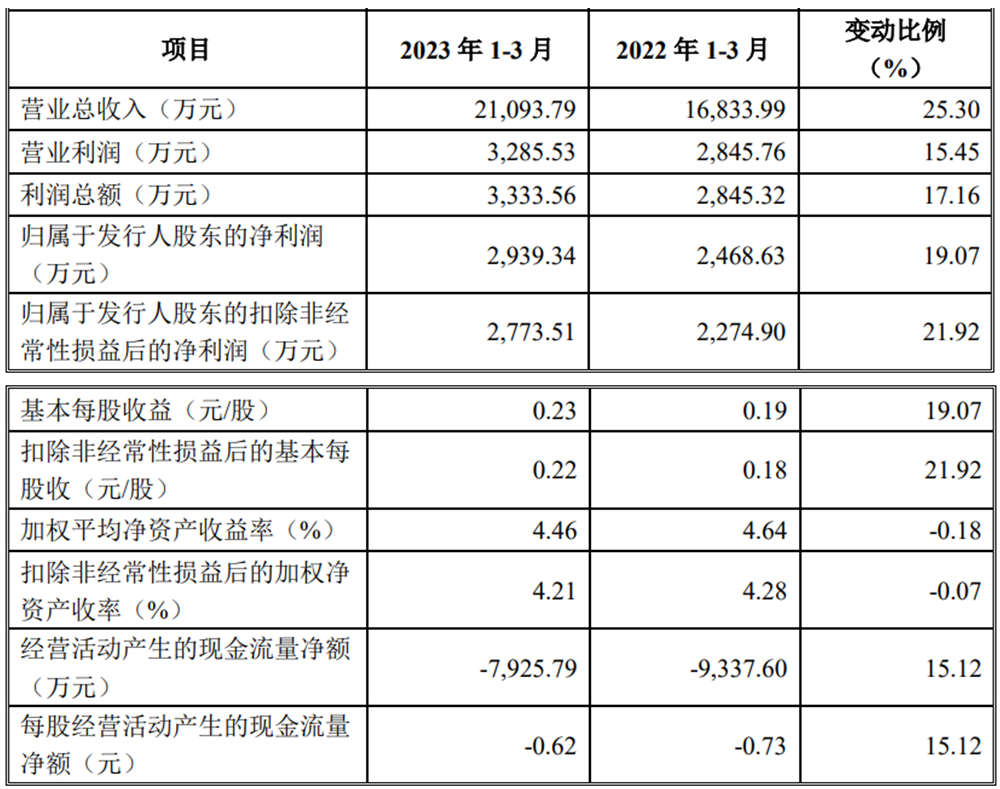 2023年一季度,蜂助手的营业收入为21,093.79万元,同比增长25.30%;归属于发行人股东的净利润2,939.34万元,同比增长19.07%;归属于发行人股东的扣除非经常性损益后的净利润2,773.51万元,同比增长21.92%;经营活动产生的现金流量净额为-7,925.79万元,上年同期为-9,337.60万元。