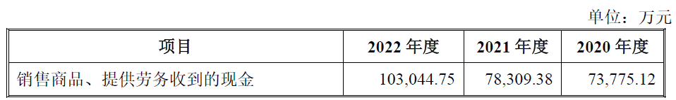 上述同期,公司销售商品、提供劳务收到的现金分别为73,775.12万元、78,309.38万元和103,044.75万元;经营活动产生的现金流量净额分别为1,565.72万元、-5,217.54万元和-12,108.93万元。