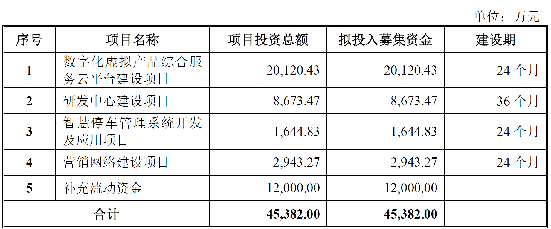 蜂助手本次发行募集资金总额为100,912.00万元,扣除发行费用后,募集资金净额为89,599.78万元。最终募集资金净额比原计划多44,217.78万元。公司2023年5月11日披露的招股说明书显示,公司拟募集资金45,382.00万元,用于数字化虚拟产品综合服务云平台建设项目、研发中心建设项目、智慧停车管理系统开发及应用项目、营销网络建设项目、补充流动资金。