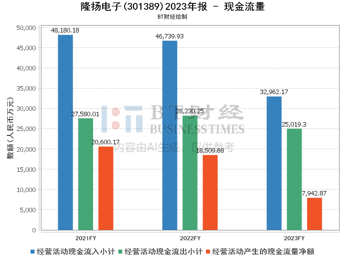 在现金流量方面,隆扬电子2023年的经营活动产生的现金流量净额为7942.87万元,较上年同期的1.85亿元下降57.09%。经营活动现金流入小计为3.3亿元,而上年同期为4.67亿元。经营活动现金流出小计为2.5亿元,较上年同期的2.82亿元有所减少。