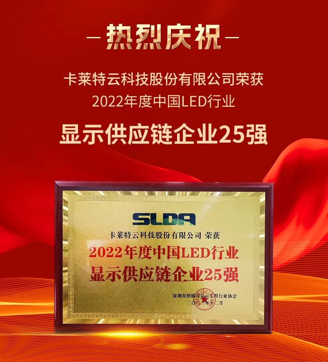 12月15日,深圳市照明与显示工程行业协会(SLDA)年会在深圳隆重举行。卡莱特凭借稳定的技术性能、良好的市场表现、稳健的发展势头双双获奖,荣获“优秀参编团体”及“2022年度中国LED行业显示供应链企业25强”荣誉称号,再次表现出出色的品牌实力,受到行业高度认可。