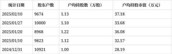 从2月12日公开信息显示,宏景科技截至2025年2月10日公司股东户数为9674户,较上期(2025年1月27日)减少326户,降幅为3.26%,变化不大。
