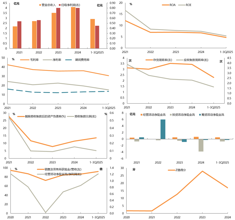 近年来公司营收规模保持增长趋势,成长性优于同行企业。2020-2024年营收CAGR为23.79%,同期同行业企业平均营收CAGR为12.42%。2020-2024年归母净利润CAGR为7.48%,同期同行业企业平均归母净利润CAGR为5.06%。1-3Q2025公司营收2.92亿元,同比增长1.48%,归母净利润0.45亿元,同比下滑19.63%,公司1-3Q2025毛利率30.63%,同比下降3.09pct。