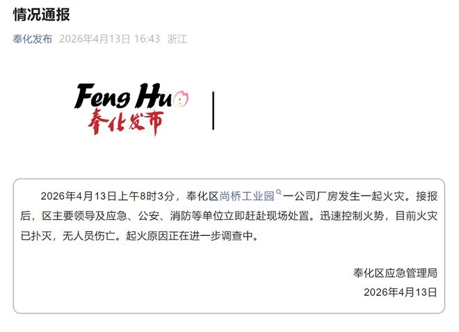 红星资本局4月13日消息,今日下午,宁波奉化区应急管理局发布情况通报称,上午8时3分,奉化区尚桥工业园一公司厂房发生一起火灾。接报后,迅速控制火势,目前火灾已扑灭,无人员伤亡。起火原因正在进一步调查中。