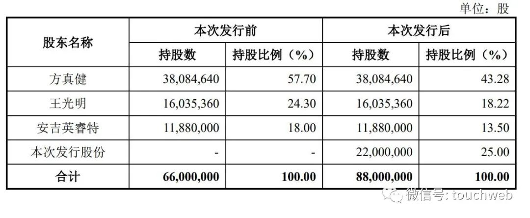 IPO后,方真健持股43.28%,王光明持股18.22%,安吉英睿特持股13.5%。