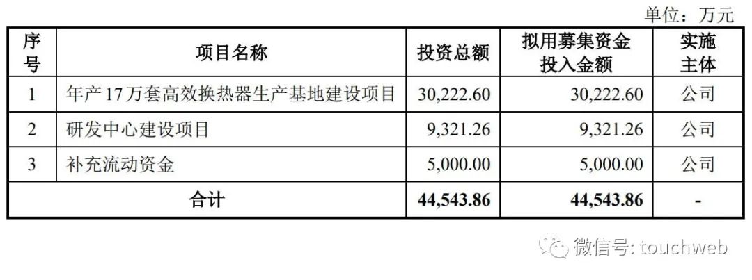 英特科技原计划募资4.45亿,其中,3亿用于年产17万套高效换热器生产基地建设项目,9321万用于研发中心建设项目,5000万用于补充流动资金。