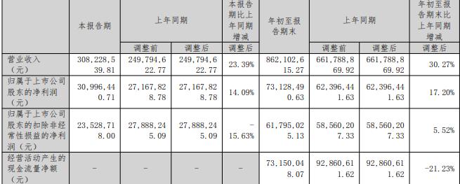 年初至报告期末,公司实现营业收入8.62亿元,同比增长30.27%;归属于上市公司股东的净利润6239.64万元,同比增长17.20%;扣除非经常性损益后的净利润5856.02万元,同比增长5.52%;经营活动产生的现金流量净额9286.06万元。