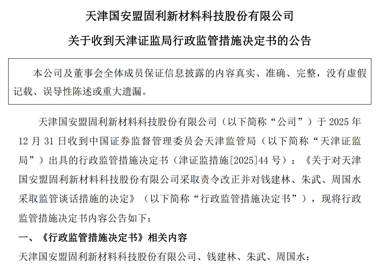 12月31日,锂电材料商盟固利公告称,收到中国证券监督管理委员会天津监管局(以下简称“天津证监局”)出具的《关于对天津国安盟固利新材料科技股份有限公司采取责令改正并对钱建林、朱武、周国水采取监管谈话措施的决定》。