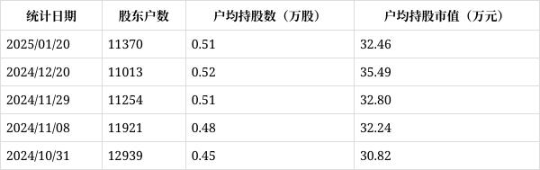 从1月27日公开信息显示,思泉新材截至2025年1月20日公司股东户数为1.14万户,较上期(2024年12月20日)减少780户,降幅为6.42%,持股趋于集中。