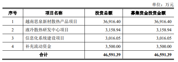 思泉新材昨晚发布2025年度向特定对象发行股票预案。本次向特定对象发行股票拟募集资金总额不超过46,591.39万元(含本数),扣除发行费用后的募集资金将用于越南思泉新材散热产品项目、液冷散热研发中心项目、信息化系统建设项目、补充流动资金。