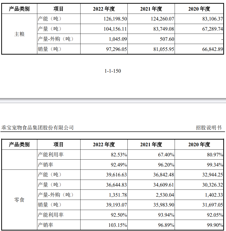 2020年至2022年,乖宝宠物的主粮产能利用率分别为80.97%、67.40%和82.53%,零食的产能利用率分别为92.05%、93.94%和92.50%。