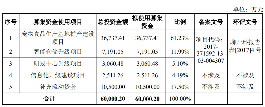 乖宝宠物本次发行募集资金总额为159,978.00万元,扣除发行费用后,募集资金净额为147,239.88万元。公司最终募集资金净额比原计划多87,239.68万元。乖宝宠物2023年8月11日披露的招股说明书显示,公司拟募集资金60,000.20万元,用于宠物食品生产基地扩产建设项目、智能仓储升级项目、研发中心升级项目、信息化升级建设项目、补充流动资金。