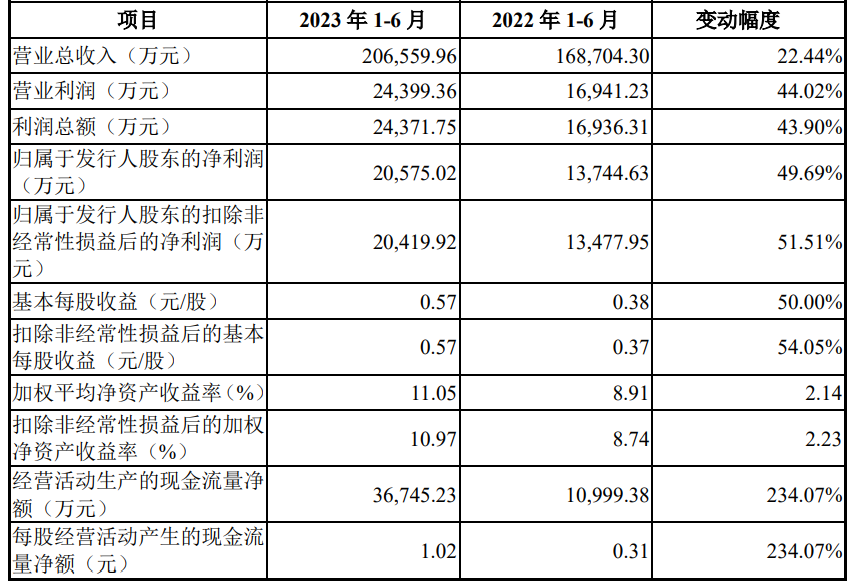 2023年1-6月,乖宝宠物的营业总收入为206,559.96万元,同比增长22.44%;归属于发行人股东的净利润为20,575.02万元,同比增长49.69%;归属于发行人股东的扣除非经常性损益后的净利润为20,419.92万元,同比增长51.51%;经营活动生产的现金流量净额为36,745.23万元,同比增长234.07%。
