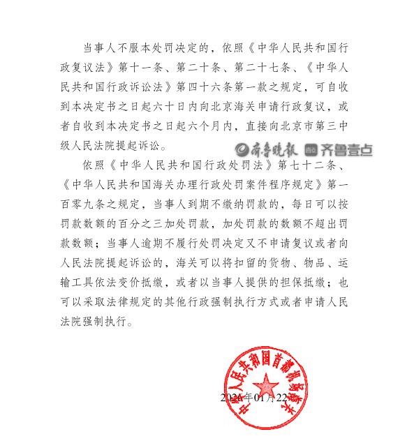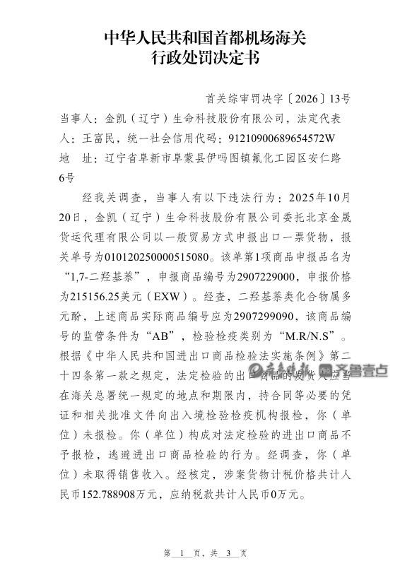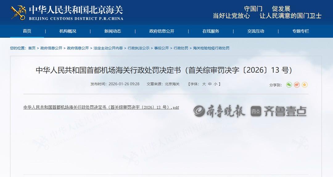 近日,中华人民共和国首都机场海关发布行政处罚决定书(首关综审罚决字〔2026〕13 号)。