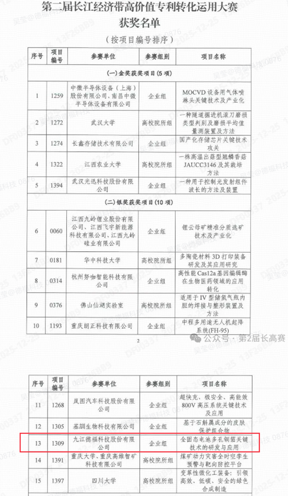 近日,第二届长江经济带高价值专利转化运用大赛在江西九江圆满落幕。九江德福科技股份有限公司(以下简称“德福科技”)携“全固态电池多孔铜箔关键技术的研发与应用”项目从1410个参赛项目中一路过关斩将,历经初赛、复赛、决赛三重考验,最终脱颖而出,成功斩获大赛银奖,其技术创新实力与专利转化价值获行业专家高度认可。