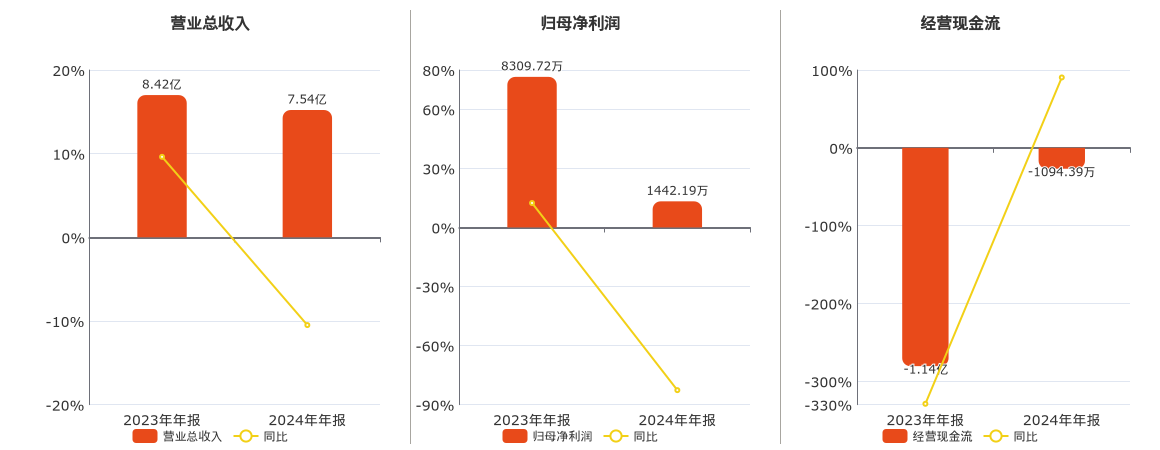 公司营业总收入为7.54亿元,较去年同报告期营业总收入减少8837.95万元,同比较去年同期下降10.49%。归母净利润为1442.19万元,较去年同报告期归母净利润减少6867.53万元,同比较去年同期下降82.64%。经营活动现金净流入为-1094.39万元。