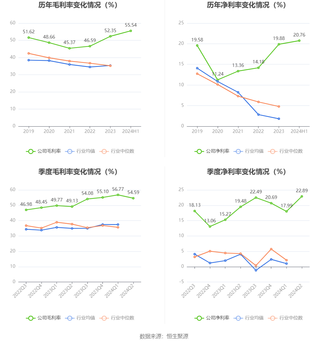 2024年上半年,公司毛利率为55.54%,同比上升6.14个百分点;净利率为20.76%,较上年同期上升3.04个百分点。从单季度指标来看,2024年第二季度公司毛利率为54.59%,同比上升5.46个百分点,环比下降2.18个百分点;净利率为22.89%,较上年同期上升3.41个百分点,较上一季度上升4.90个百分点。