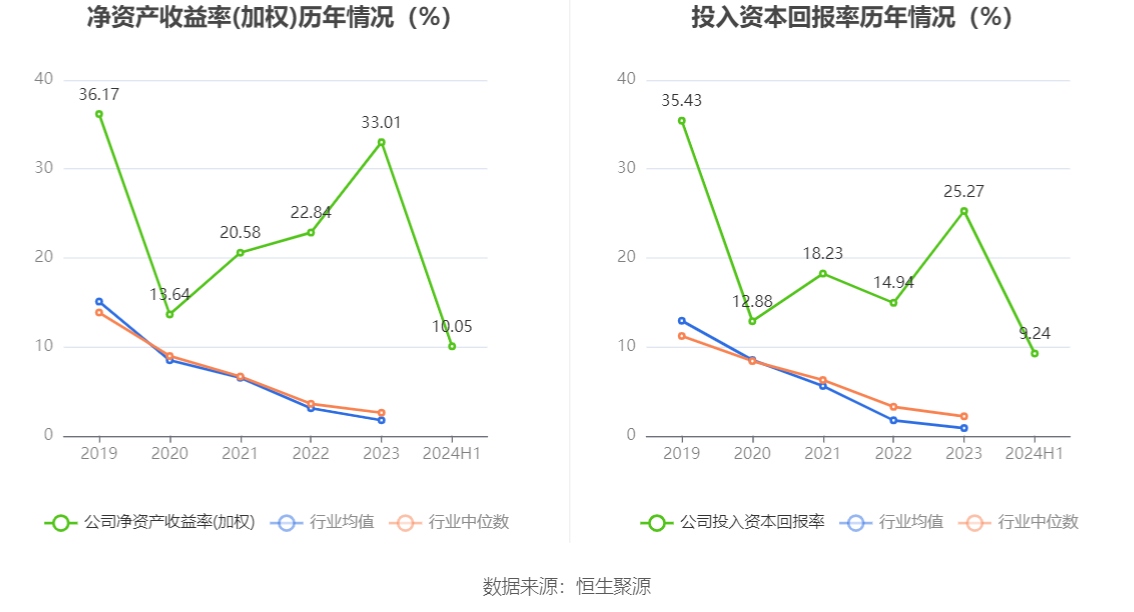 数据显示,2024年上半年公司加权平均净资产收益率为10.05%,较上年同期下降3.93个百分点;公司2024年上半年投入资本回报率为9.24%,较上年同期下降1.00个百分点。