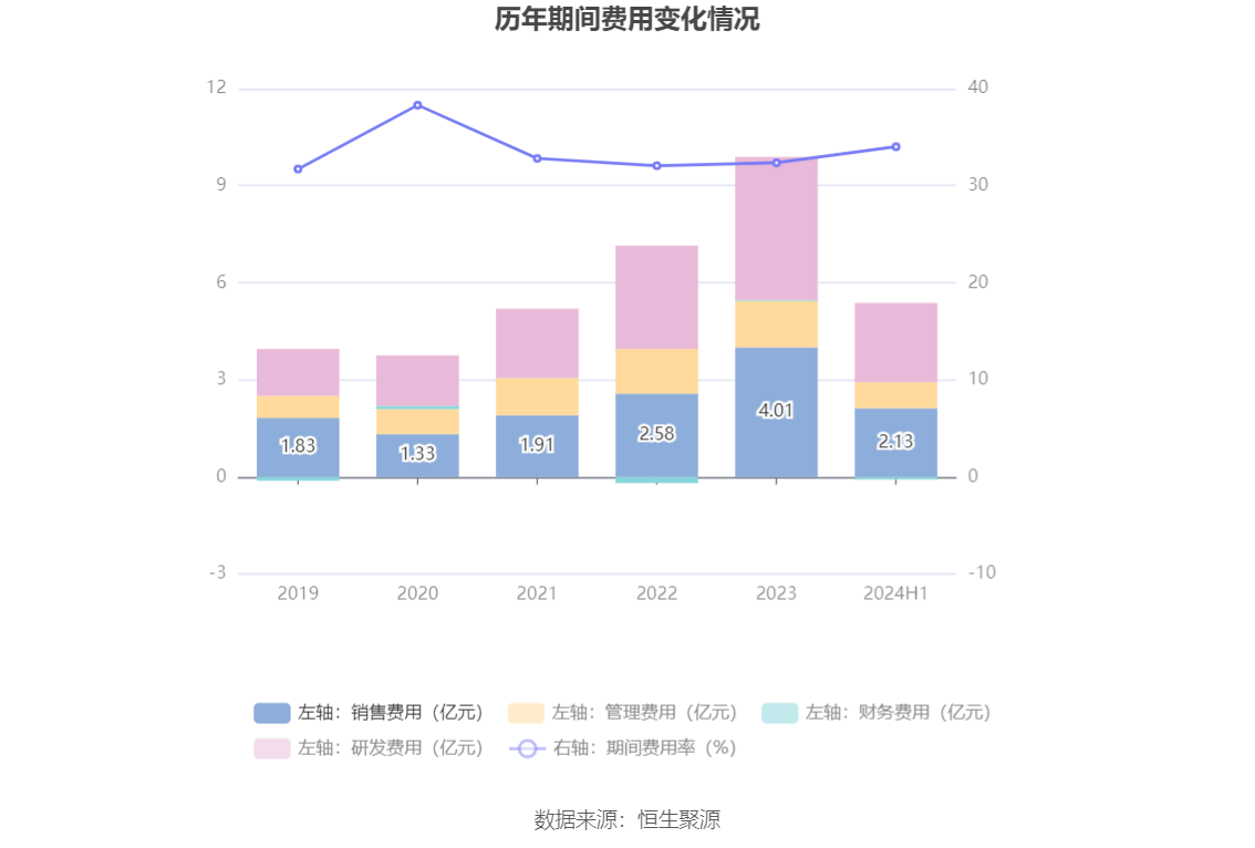 2024年上半年,公司期间费用为5.32亿元,较上年同期增加1.22亿元;期间费用率为34.02%,较上年同期上升3.17个百分点。其中,销售费用同比增长28.87%,管理费用同比增长25.1%,研发费用同比增长35.4%,财务费用由去年同期的-62.18万元变为-698.58万元。
