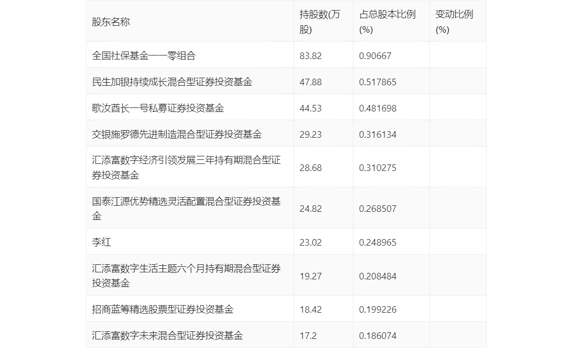 半年报显示,2024年上半年末公司十大流通股东中,新进股东为全国社保基金一一零组合、歌汝酋长一号私募证券投资基金、李红、招商蓝筹精选股票型证券投资基金。在具体持股比例上,民生加银持续成长混合型证券投资基金、交银施罗德先进制造混合型证券投资基金、汇添富数字生活主题六个月持有期混合型证券投资基金持股有所上升,汇添富数字经济引领发展三年持有期混合型证券投资基金、国泰江源优势精选灵活配置混合型证券投资基金、汇添富数字未来混合型证券投资基金持股有所下降。