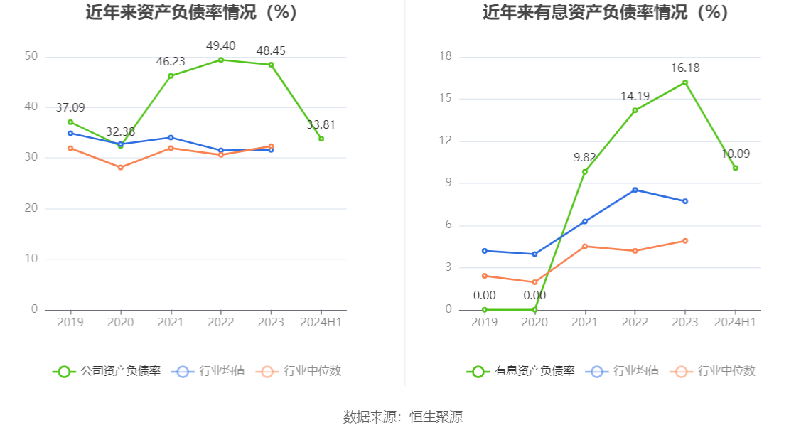 在偿债能力方面,公司2024年上半年末资产负债率为33.81%,相比上年末下降14.64个百分点;有息资产负债率为10.09%,相比上年末下降6.09个百分点。