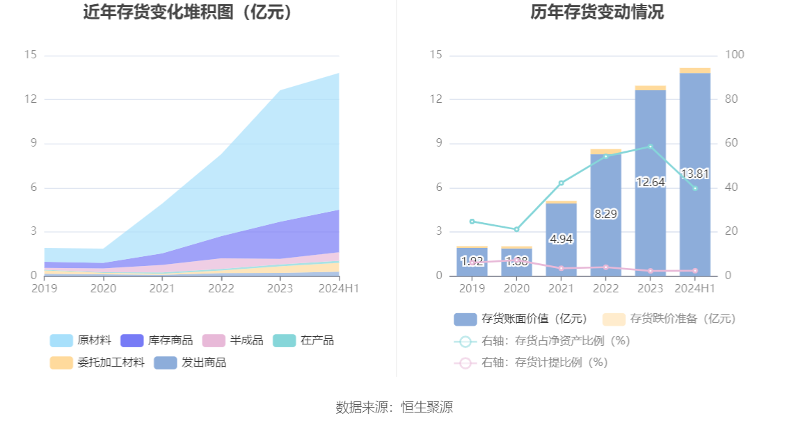 从存货变动来看,截至2024年上半年末,公司存货账面价值为13.81亿元,占净资产的39.81%,较上年末增加1.17亿元。其中,存货跌价准备为3469.96万元,计提比例为2.45%。