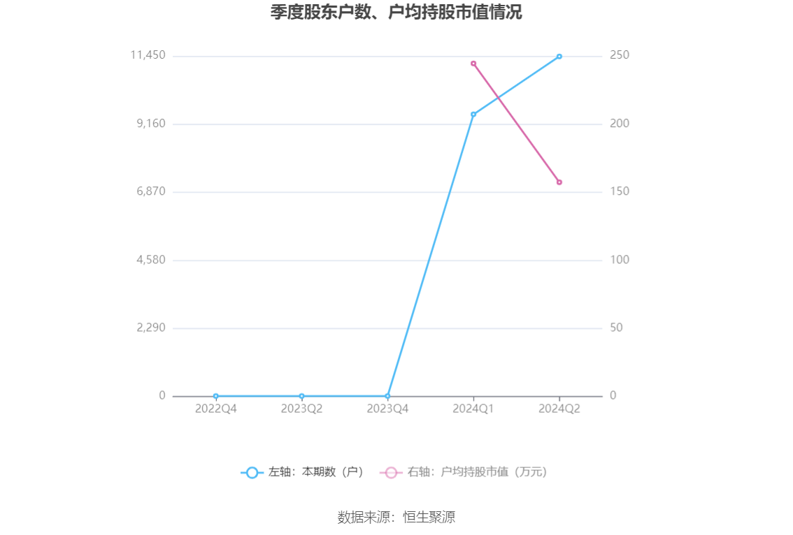 筹码集中度方面,截至2024年上半年末,公司股东总户数为1.14万户,较一季度末增长了1947户,增幅20.52%;户均持股市值由一季度末的244.46万元下降至157.26万元,降幅为35.67%。
