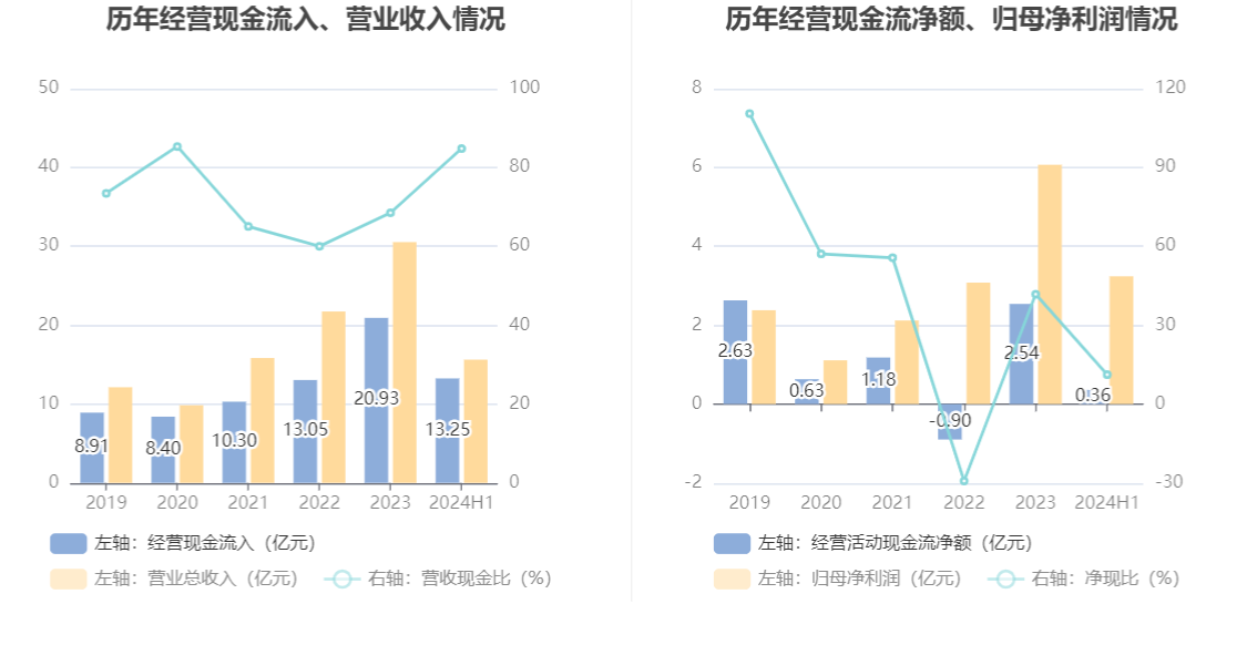 2024年上半年,公司营业收入现金比为84.79%,净现比为11.17%。