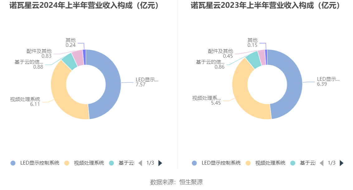 分产品来看,2024年上半年公司主营业务中,LED显示控制系统收入7.57亿元,同比增长18.53%,占营业收入的48.42%;视频处理系统收入6.11亿元,同比增长12.26%,占营业收入的39.12%;基于云的信息发布与管理系统收入0.88亿元,同比增长1.93%,占营业收入的5.62%。