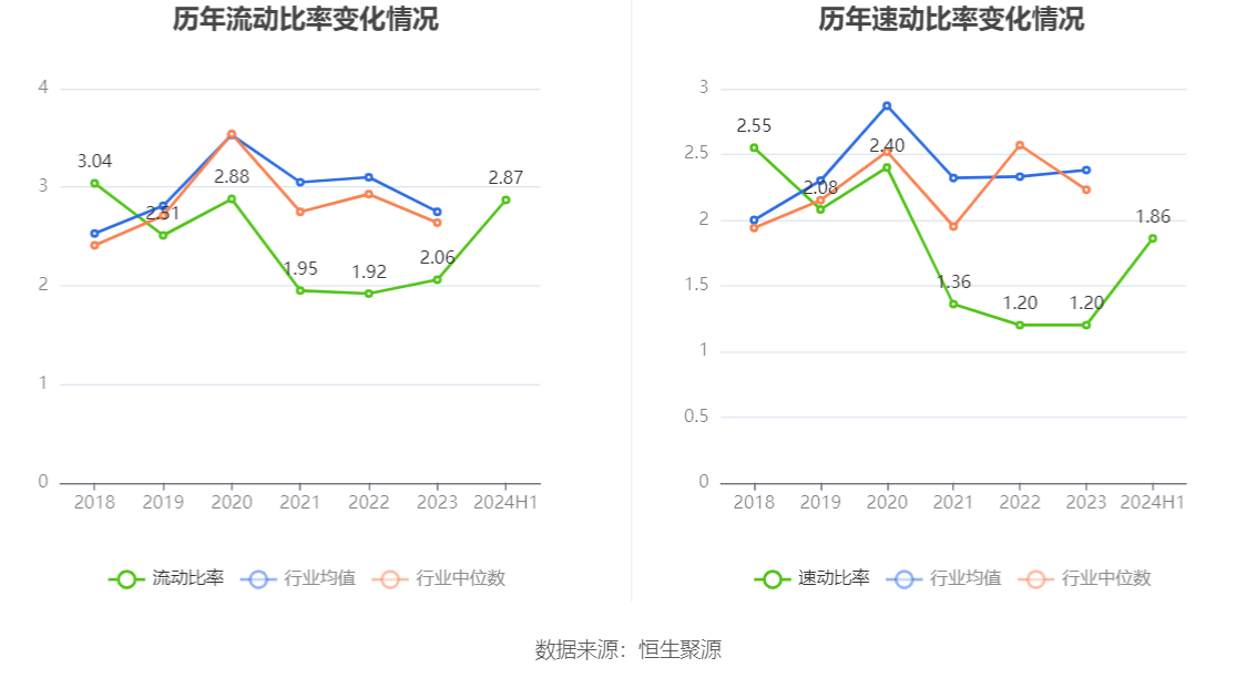 2024年上半年,公司流动比率为2.87,速动比率为1.86。