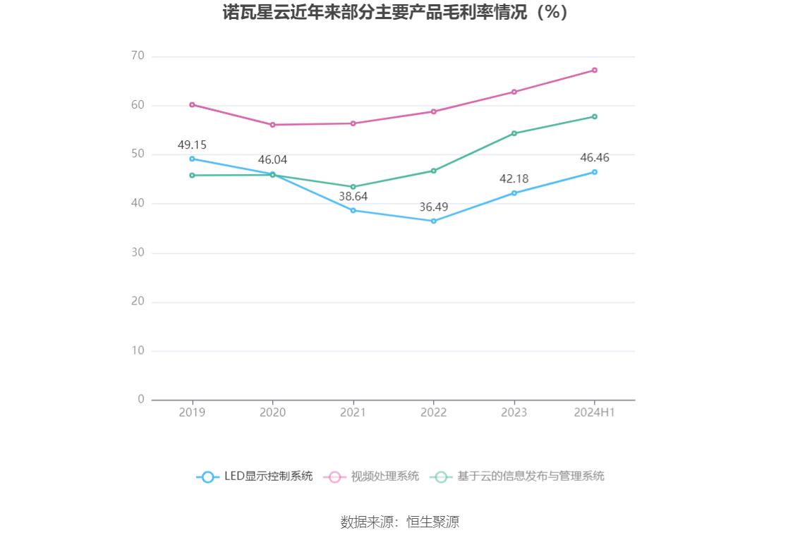 分产品看,LED显示控制系统、视频处理系统、基于云的信息发布与管理系统2024年上半年毛利率分别为46.46%、67.21%、57.75%。