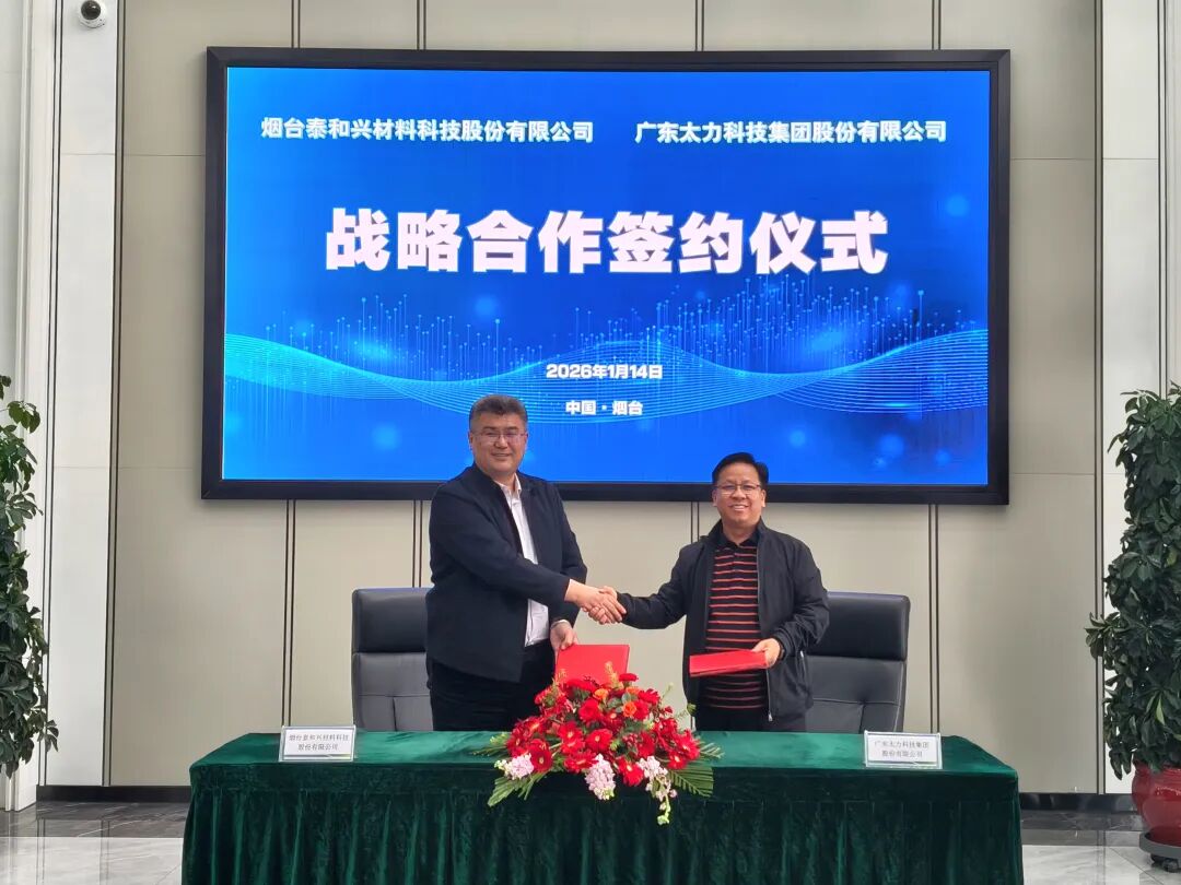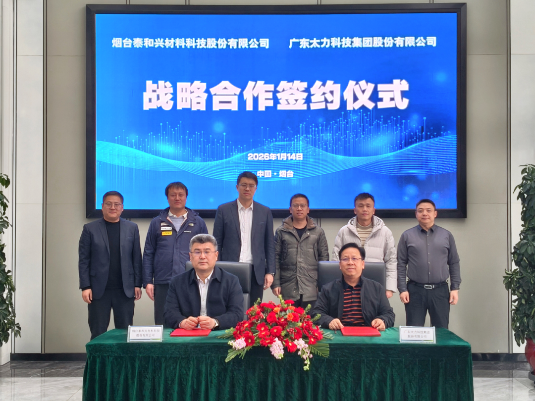 2026年1月14日,泰和新材旗下烟台泰和兴材料科技股份有限公司(以下简称“泰和兴”)与广东太力科技集团股份有限公司在山东烟台正式举行战略合作协议签约仪式。泰和新材党委副书记、泰和兴董事长邱召明,太力科技董事长石正兵等人共同见证这场跨界融合、聚力创新的产业盛事。