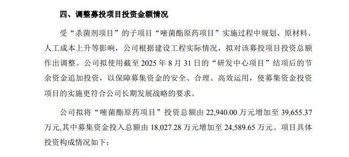 由于置换预先投入募投项目的自筹资金,截至2025年8月31日, 泰禾股份 “杀菌剂项目”累计投资金额达2.68亿元。而公司“研发中心项目”累计投资金额达5589.03亿元,占调整后拟投募资的46%,“结余”6562.37万元。