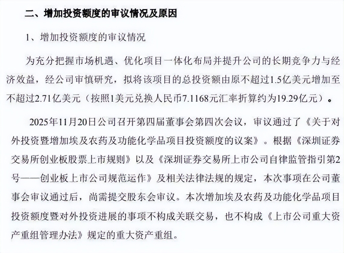 近期, 泰禾股份 在海外投资与国内募资项目上动作频频却争议不断,公司将埃及农药及功能化学品项目投资额从1.5亿美元,增长至2.71亿美元。