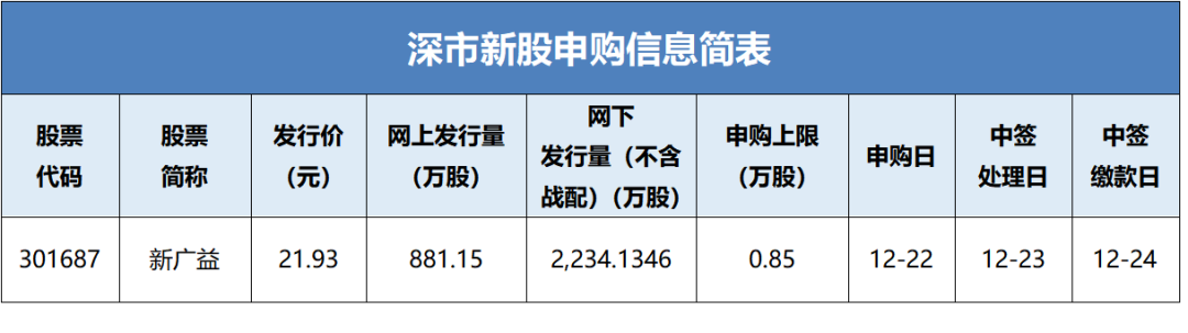 2025年12月22日,苏州市新广益电子股份有限公司(简称:新广益)将通过深交所网下发行电子平台和交易系统发行新股,具体信息如下。