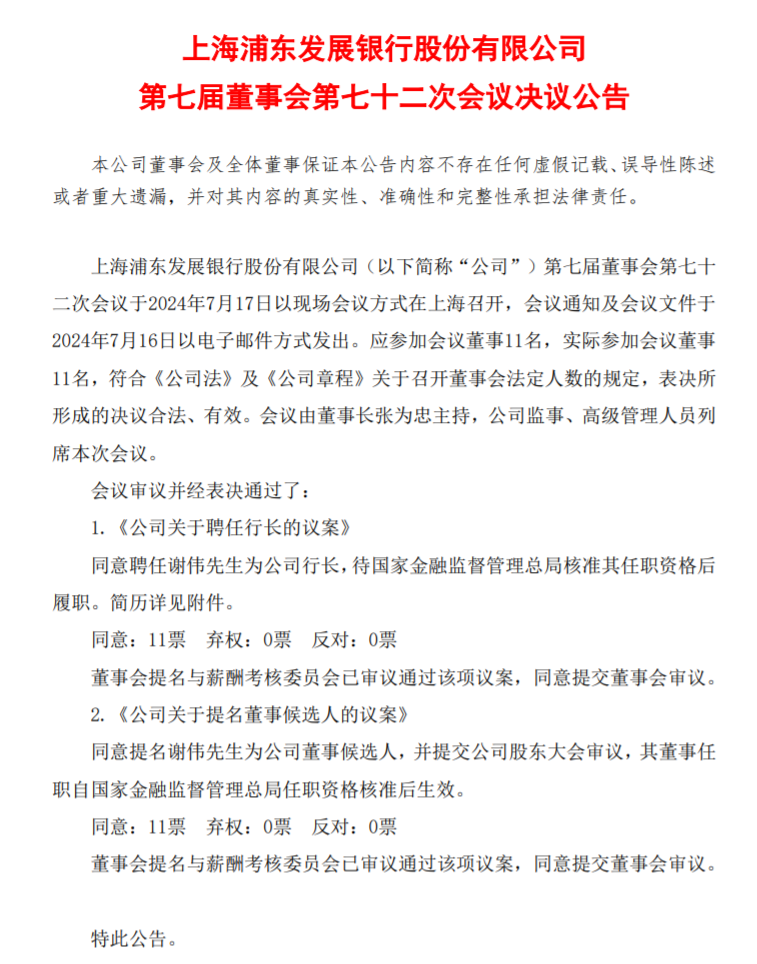 浦发银行原党委委员、副行长谢伟,成为了新行长。