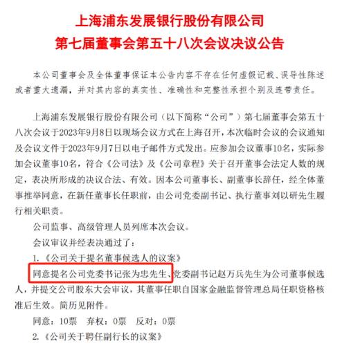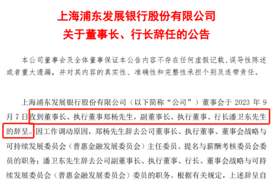 去年9月,浦发银行董事长郑杨、行长潘卫东双双辞职。