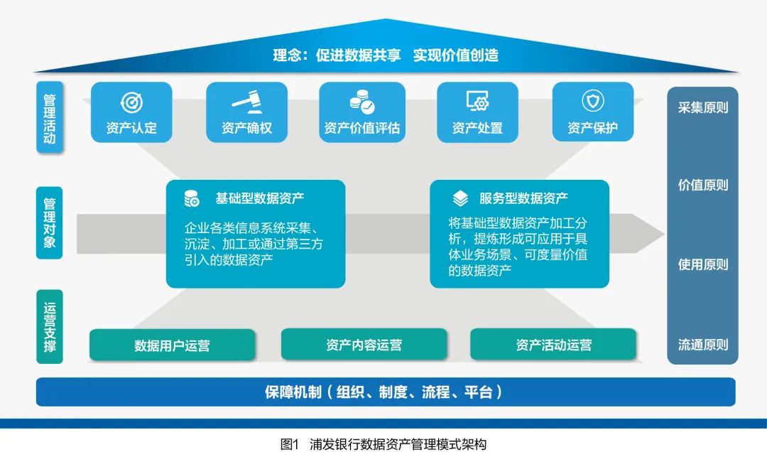 政策、监管和市场环境的复杂性,使得数据资产管理和运营受到多重因素制约和影响。为此,浦发银行数据资产管理体系明确了采集、价值、使用、流通四项管理原则,确保数据采集、价值评估、使用、流通等资产化全过程合法合规。