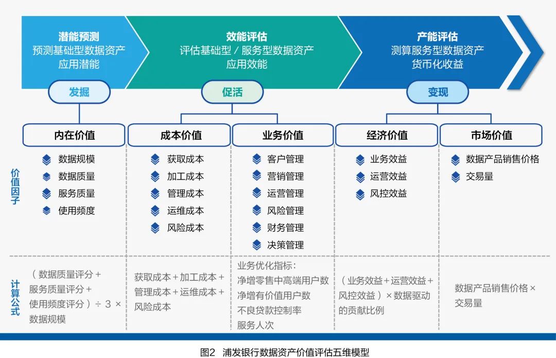 数据资产价值评估。浦发银行采用成本法、收益法、市场法等评估方法,围绕数据资产的内在特性、费用成本、经济效益等维度,科学设计数据资产价值评估指标,构建数据资产价值评估体系。同时,在全行树立“促进数据共享,实现价值创造”的数据资产管理理念,鼓励管理和业务运营各个领域、各个环节挖掘数据资源,拓展数据应用场景,推动数据资产开发利用和价值实现。