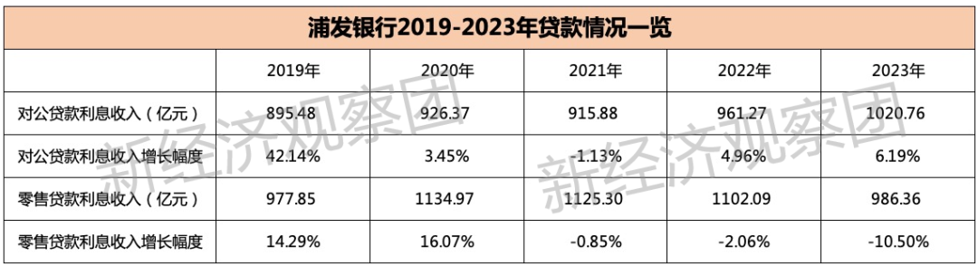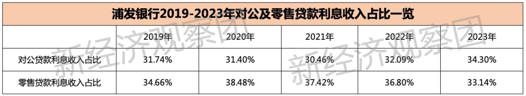 2019-2022年,浦发银行对公利息收入占比分别为31.74%、31.40%、30.46%、32.09%和34.30%,均低于同期零售贷款利息收入占比,即34.66%、38.48%、37.42%、36.80%。直到2023年,对公贷款利息占比达到34.30%,在近五年来首次超过零售贷款利息收入,后者为33.14%。