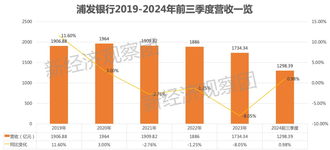 新经济观察团统计发现,2019年-2024年前三季度,浦发银行营收分别为1906.88亿元、1964亿元、1909.82亿元、1886亿元、1734.34亿元和1298.39亿元,波动中逐年降低。