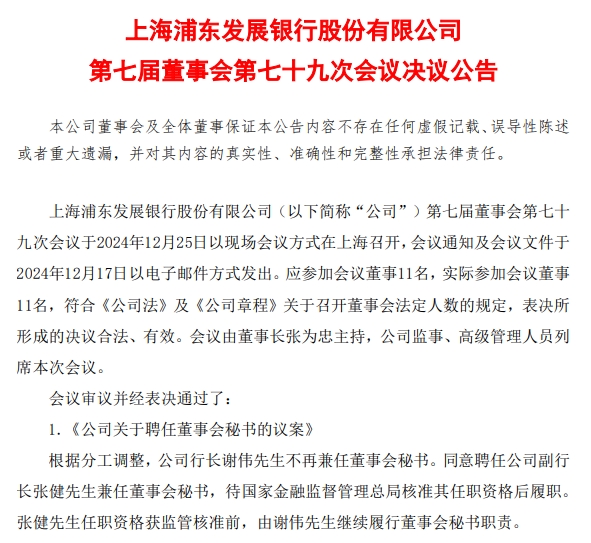 据浦发银行12月27日公告,副行长张健将兼任董事会秘书,任职资格待监管核准。