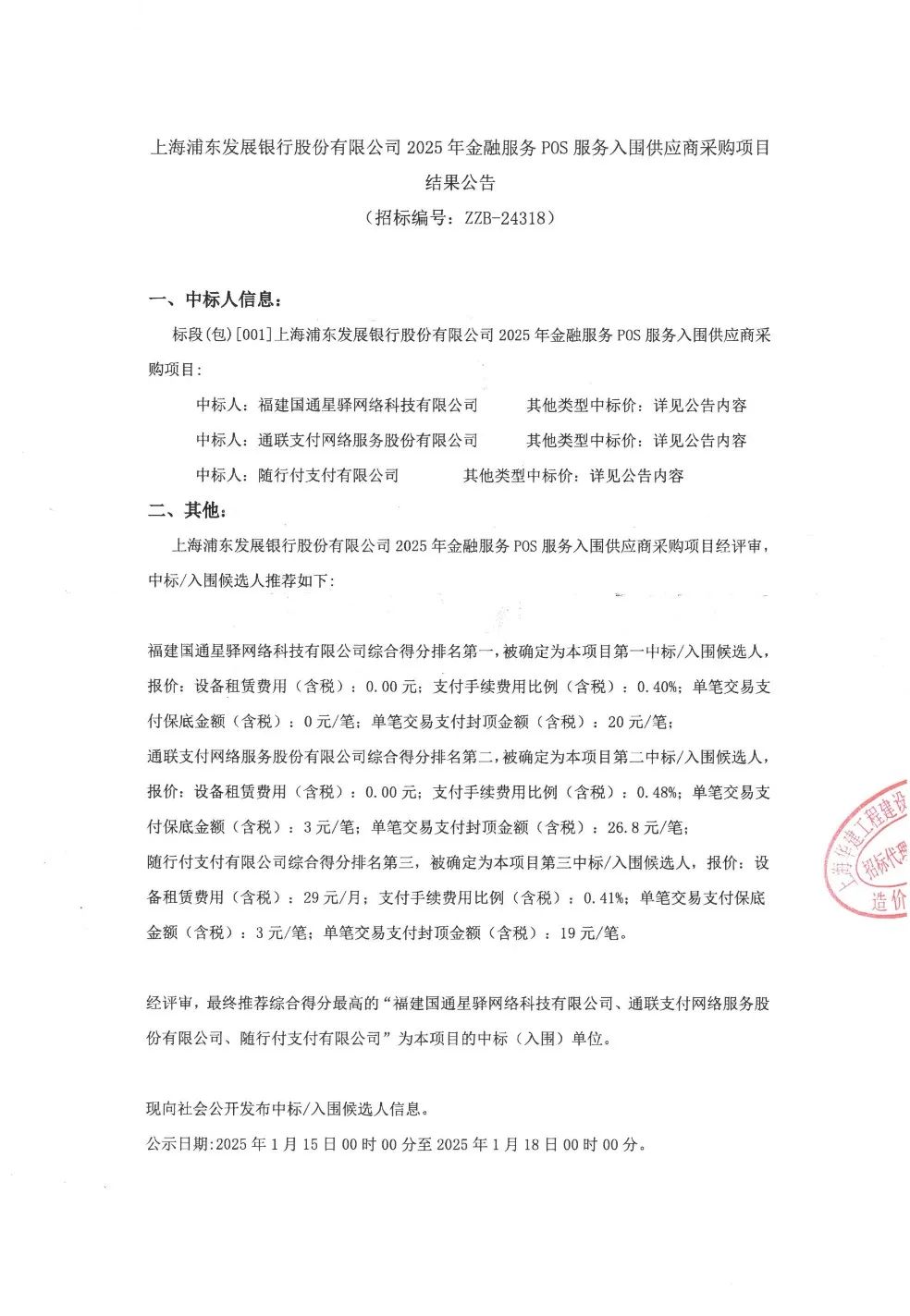 费率最低0.4%,三家支付机构入围浦发银行2025年POS服务项目!