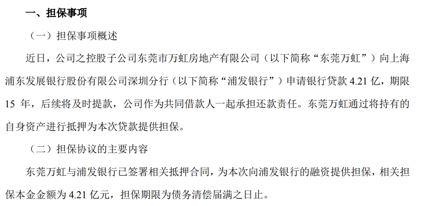 东莞万虹通过将持有的自身资产进行抵押为本次贷款提供担保,万科作为共同借款人一起承担还款责任。