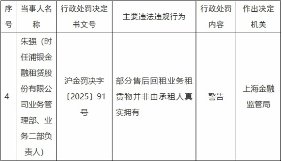 国家金融监督管理总局网站昨日公布的上海监管局行政处罚信息公开表(沪金罚决字〔2025〕91号)显示,时任浦银金融租赁股份有限公司业务管理部、业务二部负责人朱强为部分售后回租业务租赁物并非由承租人真实拥有的相关责任人。上海金融监管局对其警告。