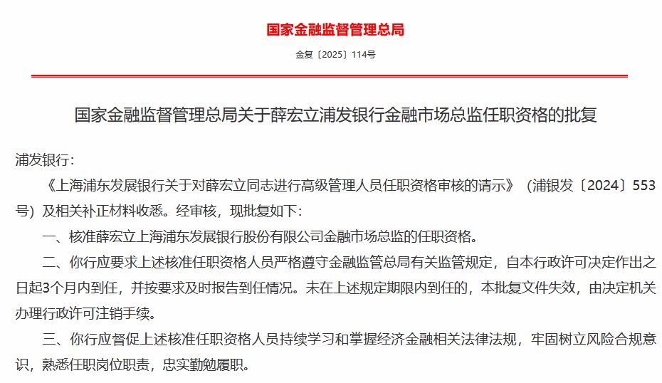 3月14日金融一线消息,国家金融监督管理总局今日发布关于薛宏立浦发银行金融市场总监任职资格的批复,以及关于张健浦发银行董事会秘书任职资格的批复,核准薛宏立上海浦东发展银行股份有限公司金融市场总监的任职资格,张健上海浦东发展银行股份有限公司董事会秘书的任职资格。