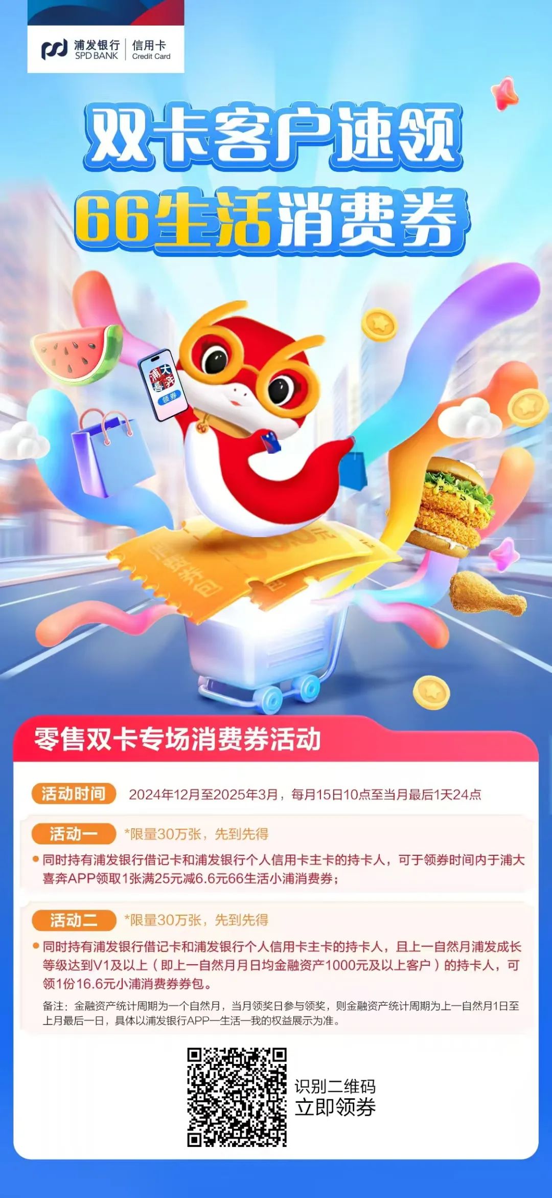 “双卡客户专享66生活消费券”活动同样亮点纷呈,持有浦发银行借记卡与浦发信用卡主卡的客户在活动时间内通过浦大喜奔APP每月可领取满25元减6.6元的66生活小浦消费券;上个自然月日均金融资产满足至少1000元的上述双卡持卡人,还可领取16.6元66生活小浦消费券包。