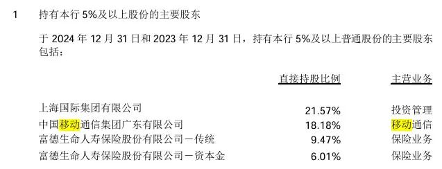 而中国移动集团广东有限公司则为浦发银行的主要股东之一,据该行2024年度年报披露广东有限公司在该行的直接持股比例高达18.18%,为仅次于上海国际集团有限公司的第二大股东。